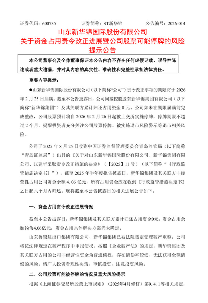 近日,山东新华锦国际股份有限公司(简称“ST新华锦”)资金占用问题整改情况引发市场高度关注。根据其2月4日发布的公告,公司责令改正事项的期限将于2026年2月25日届满,截至公告披露日,公司间接控股股东新华锦集团有限公司及其关联方累计归还占用资金仍为0元,资金占用余额约4.06亿元,且具体解决方案尚未确定。
